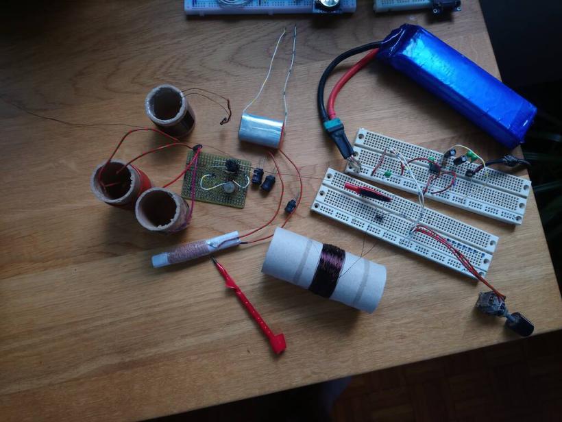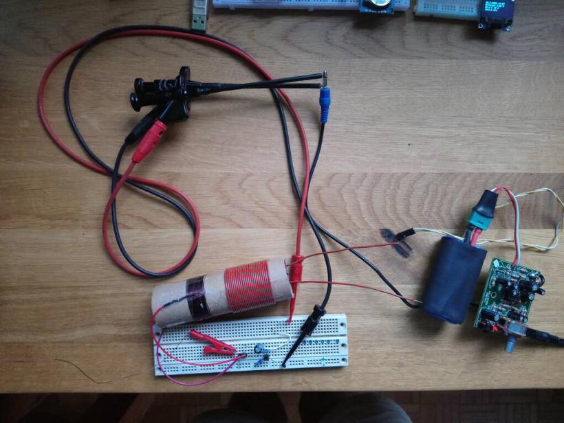 21.8.2022: Meine Versuche habe ich weiterentwickelt. Nach Anschaffung eines LCR Meters war die Spulenwicklerei endlich steuerbar, und nicht mehr nur lauter Experimentiererei. Endlich habe ich auch die Transistorschaltung von B.Kainka zum Laufen gebracht (meine Experimentierplatine hatte eine Unterbrechung der Masse).