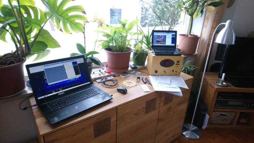 Oben auf dem Radio steht der Notebook, der SSTV emfängt, von einer weiteren kleinen Platine mit Arduino Nano und dem si4735. Übrigens in Ergänzung zu PU2CLR's Hinweisen: es genügt sehr wohl, den si4735 mit den 3 Volt vom Arduino zu versorgen, wenn man am USB-Anschluss ist, aber man muß einen dicken Elko zur Stabilisierung verwenden: 1000µF. Scheinbar ist nur beim Einschalten des si4735 eine Schwankung vorhanden, die damit geglättet wird. (Meinen Versuch hatte ich mit einem Arduino Nano Nachbau gemacht)