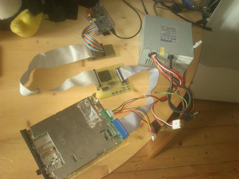 Raspberry Pi steuert Intel 82078 Floppy Controller, an dem ein 5 1/4" Floppy - Laufwerk mit 360kb hängt.