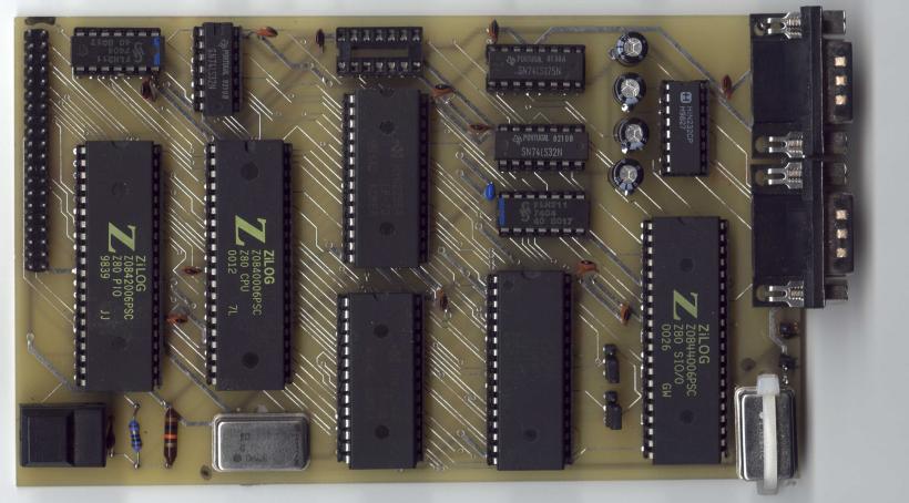Z80 Vollausbau mit 64 kb Ram, SIO, PIO, EEPROM. Er läuft unter CP/M 2.2 Eine der beiden seriellen Schnittstellen ist das Terminal, die andere emuliert den Floppy Controller. Dafür habe ich ein Programm entwickelt, das die Floppy Images über die Schnittstelle serviert. Mit Eagle Cad selbst entworfen, bei PCB-Pool entwickelt und selbst gelötet.
